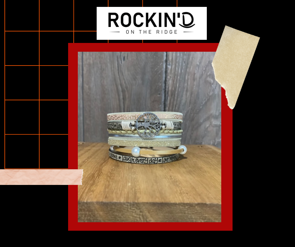 Layers of different leather bracelets creating a cuff look with a tree of life